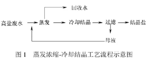 蒸發(fā)濃縮-冷卻結(jié)晶工藝技術(shù)是通過蒸發(fā),使高鹽廢水濃縮,最后對(duì)濃縮液進(jìn)行冷卻,從而使高鹽廢水中可溶性鹽類物質(zhì)結(jié)晶分離出來的工藝技術(shù)。該工藝能使部分鹽類物質(zhì)分離出來,得到結(jié)晶鹽類化合物,而結(jié)晶母液則需要返回至前面蒸發(fā)工段進(jìn)行再循環(huán)蒸發(fā)濃縮處理,工藝流程如圖。