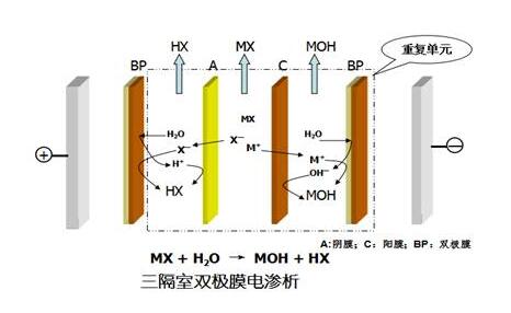 在直流電場中,利用雙極膜解離水成氫離子和氫氧根離子的特性及陰、陽離子交換膜分別對陰、陽離子選擇透過性,將鹽溶液轉(zhuǎn)化成酸和堿溶液。